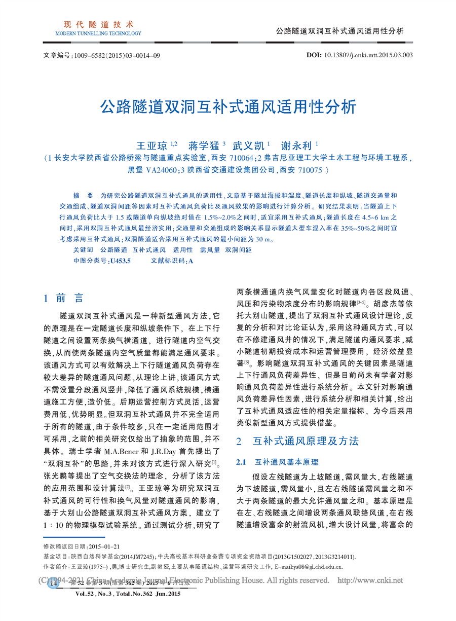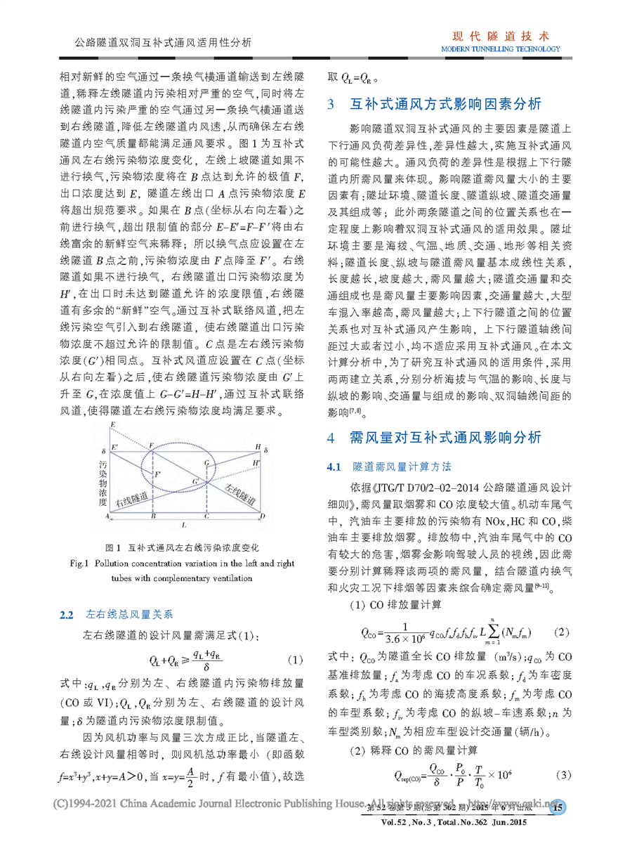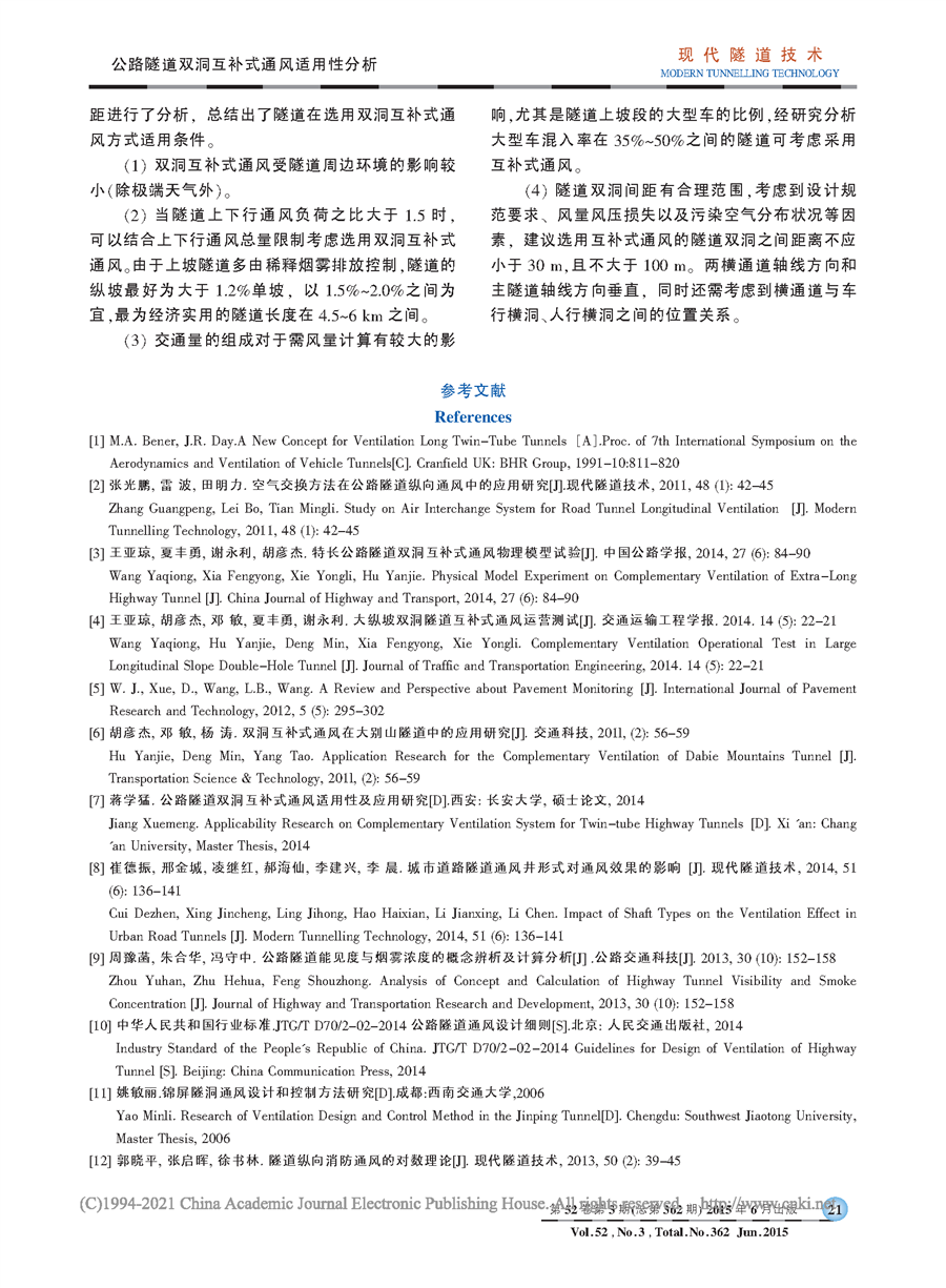 公路隧道双洞互补式通风适用性分析